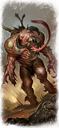 Some amongst the Children of Chaos are bestowed with an abundance of the Dark Ones' gifts, becoming creatures whose bodily forms epitomise nightmare and unreason. Such creatures might once have been great Chieftains who called upon the favour of the Dark Gods one time too many. They might have been Bray-Shamans who drew too deep of the power of Chaos, their forms blasted beyond recognition by the raw power of Magic. It may even have been one who strayed too close to Morghur, Master of Skulls, whose aura of transmogrification changes all. In some cases, the creature might simply have been born that way, in all likelihood slaughtering its beast-mother in the process. When the warherd goes to battle, the Chaos spawn come shambling from their lairs. The Beastmen have no control over a Spawn's actions, and it will behave in a largely unpredictable manner. The Spawn will move towards the enemy and crash flailing into its ranks; teeth, claws, and tentacles tearing men limb from limb in a shower of blood and ruination before it is finally put out of its misery.