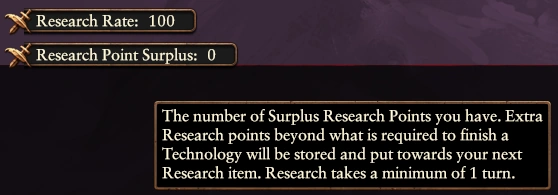 With our new system, when you finish researching a technology with surplus points, those extra points will be stored as 'research point surplus' in your technology tree. This surplus will then automatically be applied to the next technology you research. Enjoy the small (but now real) benefits of 5% research rate in the long, long run.