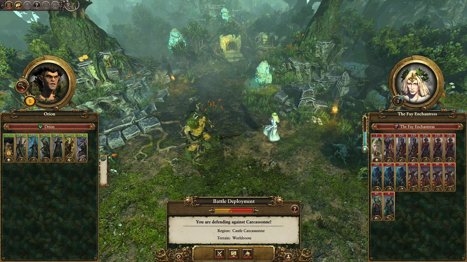 A Wood Elves army can enter the Use Worldroots stance to cross the campaign map through the Worldroots. If a Wood Elves army is intercepted / attacked in the Use Worldroots stance, then the battle will be fought on the Worldroots map. The Worldroots battle map is similar to the Beast-Paths battle map and certain Underway maps as it is a long, narrow map with little room to maneuver at the sides.